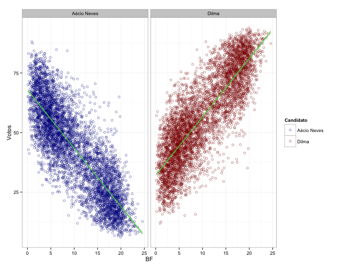 Fábio Vasconcellos e Daniel Lima fizeram alguns gráficos interessantes sobre a correlação de algumas variáveis socioeconômicas e o percentual de votos recebidos por cada candidato. Um deles – e que sempre suscita polêmica – é a relação entre percentual de votos versus percentual de pessoas beneficiadas pelo bolsa família por município. Segue uma reprodução do gráfico abaixo, feita no R com o ggplot2.