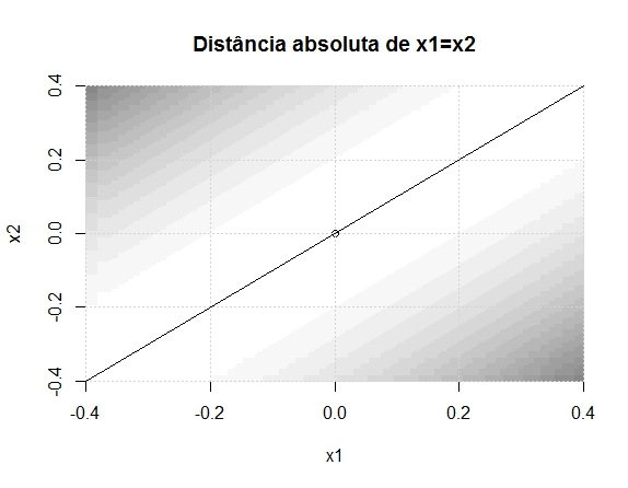 Já na estatística 2, perceba que o termo principal é (x1 – x2)^2, e o que se mede é a distância do ponto em relação à curva x1=x2. Isto é, a distância absoluta de x1 em relação a x2. Vejamos as curvas de nível. Note que ao longo da curva há diversas regiões em branco, mesmo quando distantes do ponto (0,0), pois o que a estatística mede é a distância entre os pontos x1 e x2 entre si.