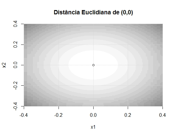 Repare como calculamos a estatística 1 e note o termo (x1^2+x2^2). Percebe-se que a estatística se torna mais extrema cada vez que o ponto (x1, x2) se distancia de (0,0) – em qualquer direção. Isto é, ela cresce com relação à distância euclidiana de (x1,x2) em relação ao ponto (0,0). Talvez isso seja mais fácil de entender com imagens. No gráfico abaixo, quanto mais escura a cor, maior é o valor da estatística de teste.