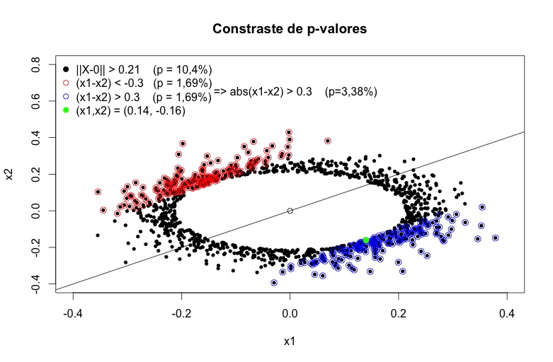 Agora deve ficar mais fácil de entender o que está acontecendo. O p-valor calcula a probabilidade de encontrar uma estatística tão grande ou maior do que a observada. Ao calcular (x1 – x2)^2, todos os pontos que são distantes de (0,0), mas são próximos entre si, não geram estatísticas extremas. Como uma imagem vale mais do que mil palavras, façamos mais uma. No gráfico abaixo, os pontos pretos são todos aqueles cuja estatística de teste supera a estatística observada (0.14, -0.16). Já os pontos azuis e vermelhos são todos os pontos que tem uma estatística de teste maior do que a observada, medidos pela distância euclidiana em relação à reta x1=x2.